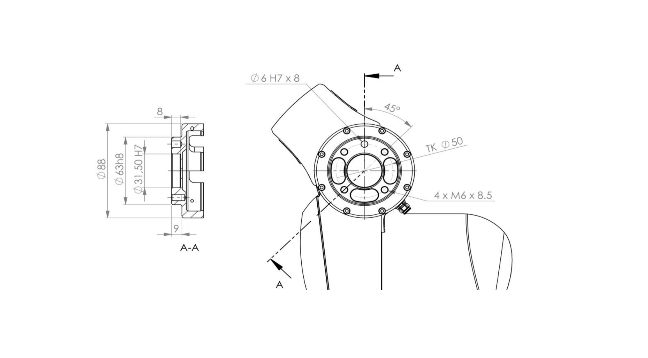 The interface/flange of Franka Hand is designed according to DIN ISO 9409-1-A50. See image